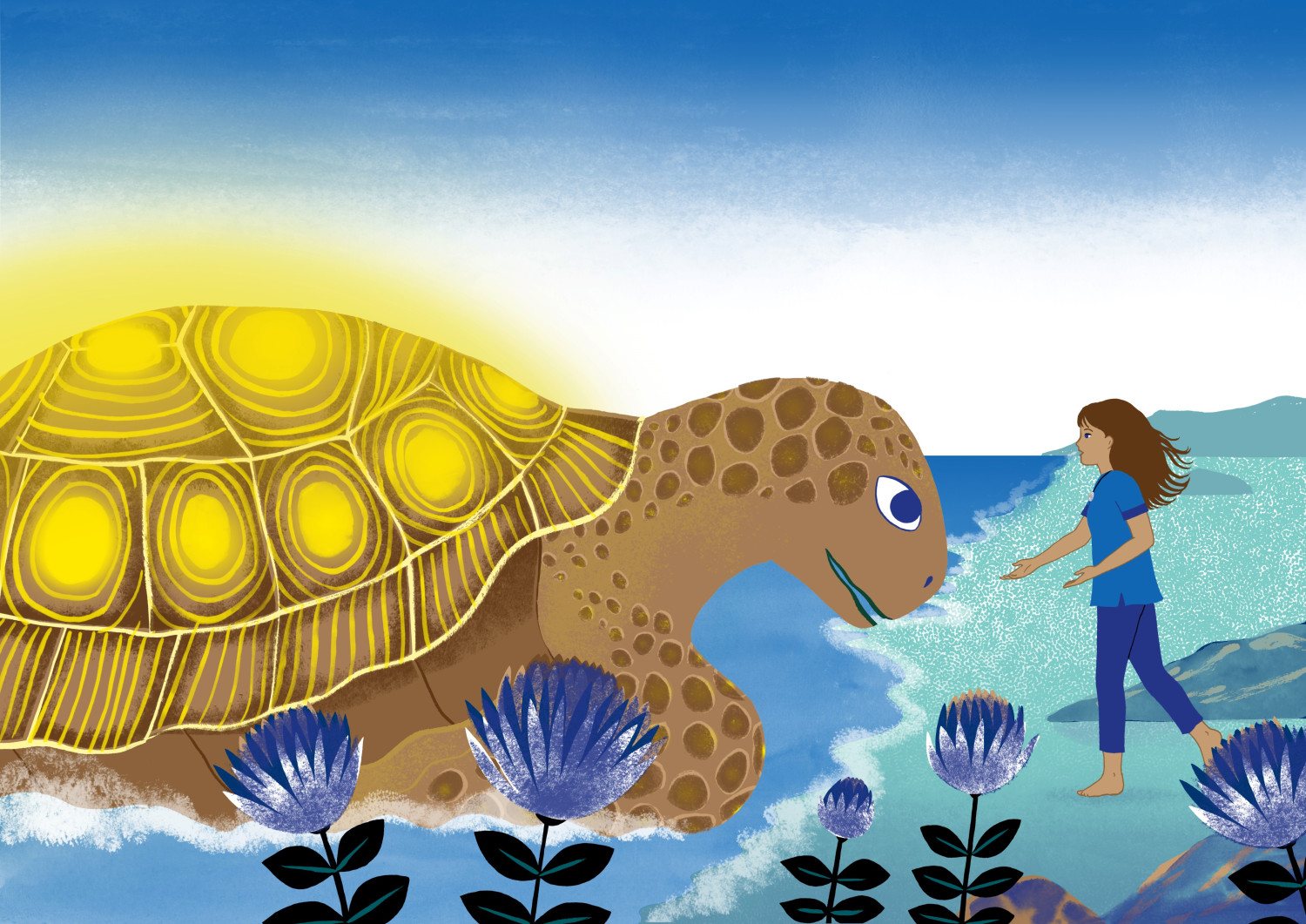 Bleu joue, sur la plage, grandit, bercée par les histoires de la mer.