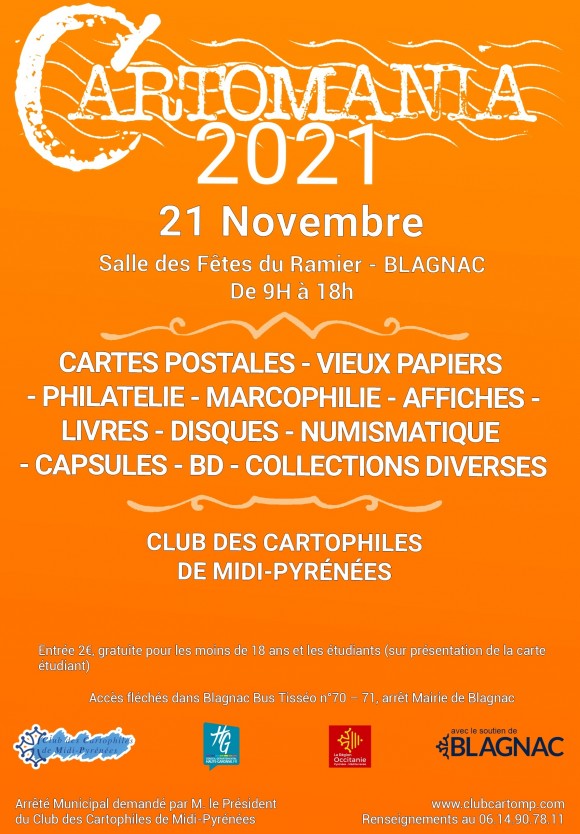CARTOMANIA 2021, bourse de collectionneurs : cartes postales, vieux papiers, philatélie, marcophilie, affiches, livres, disques, numismatique, capsules, BD, collections diverses.