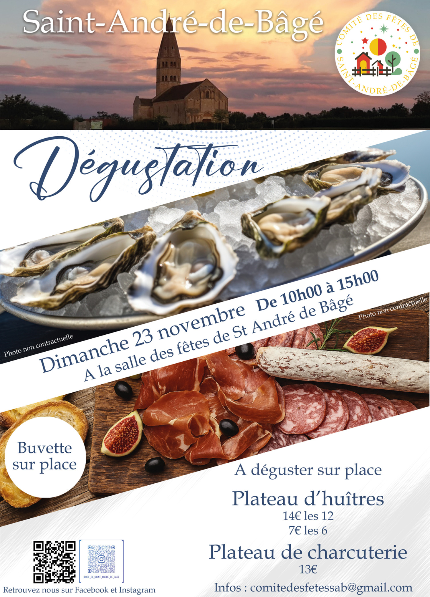 Ce dimanche 23 novembre, rendez-vous à Saint-André-de-Bâgé pour une dégustation d’huîtres et de charcuterie à la salle des fêtes !