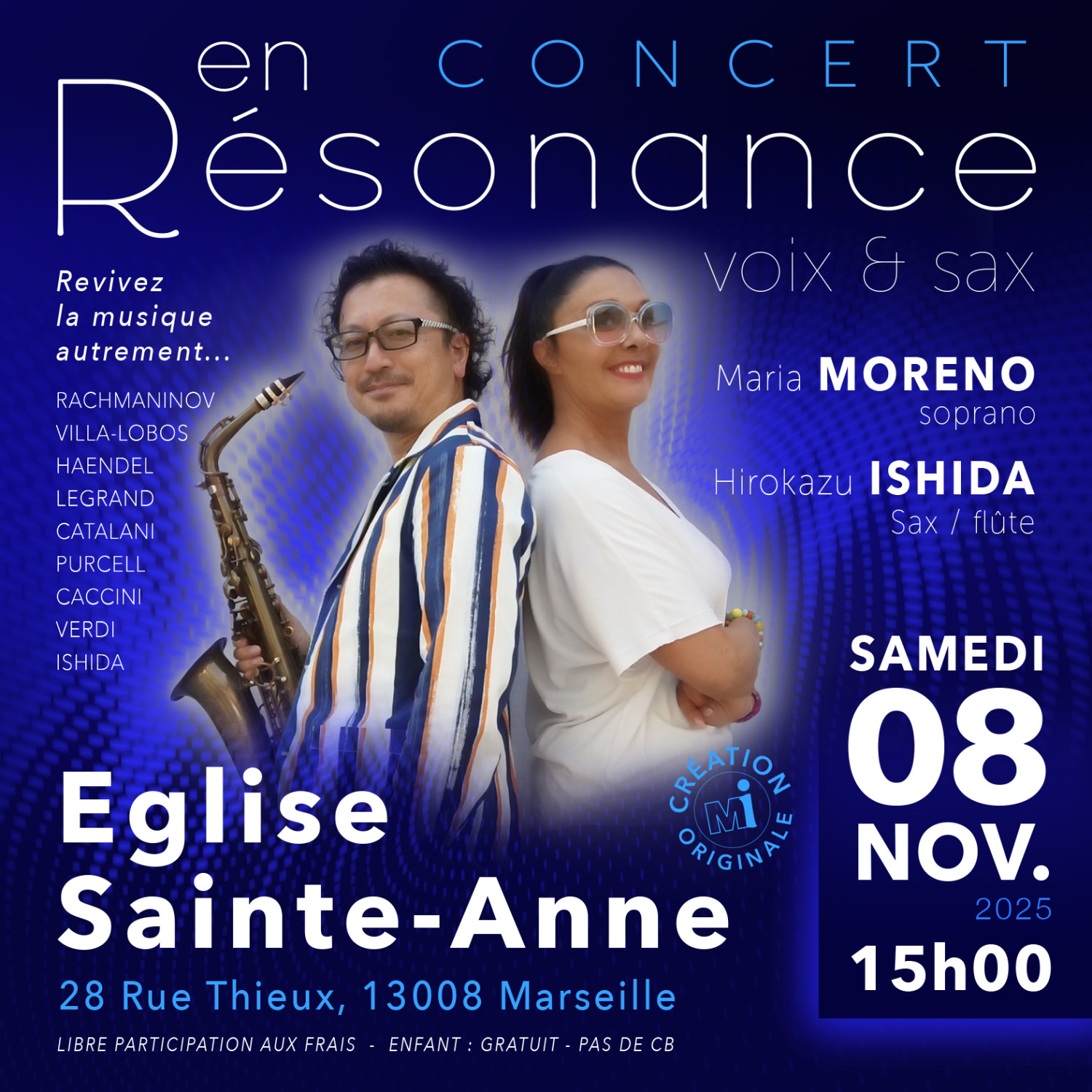 "En Résonance" est une création originale qui réunit la soprano Maria Moreno et le saxophoniste japonais Hirokazu Ishida. Redécouvrez les grands airs d'opéra et les mélodies de Purcell, Rachmaninov, Haendel, Caccini, ainsi que certains grands standards de Michel Legrand.