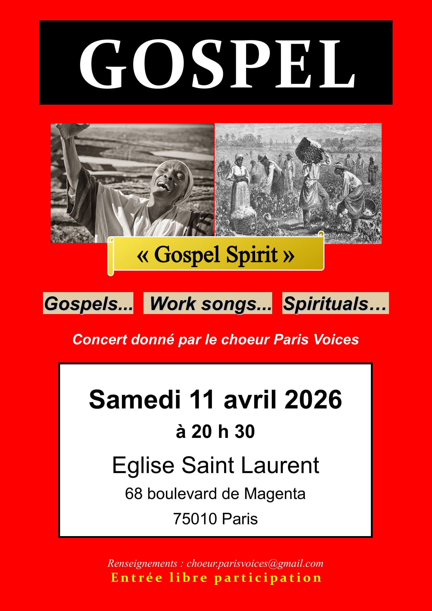 Avec ce concert intitulé "Gospel Spirit", le choeur Paris Voices vous invite à retrouver les racines de ces chants interprétés originellement au XIXe siècle, par les esclaves dans les plantations de coton aux Etats Unis.
