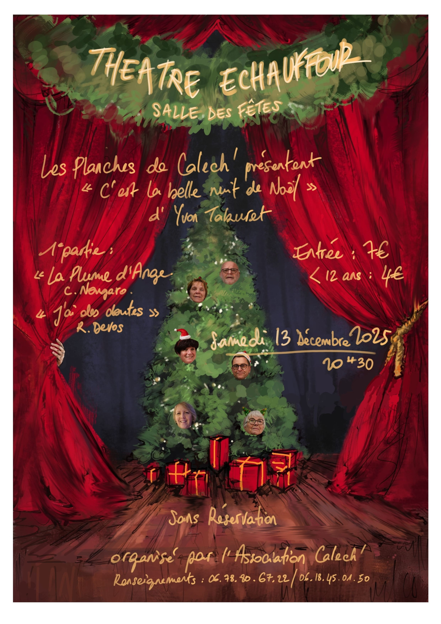 Pour finir en beauté notre saison théâtrale 2025, l'équipe des Planches de Calech vous propose une dernière représentation de la pièce de Yvon Taburet " La belle nuit de Noël " le SAMEDI 13 décembre 2025 à 20h30 à la salle Amazone d' Echauffour. En première partie l'ami Laurent vous enchantera avec poésie et humour .